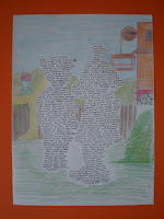 "Kiri muinasjutu tegelastes", musta pastakaga kiri ja taust värviliste pliiatsitega
